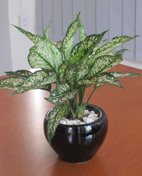 - Tên khoa học: Dieffenbachia picta - Họ thực vật: Araceae – Họ Ráy - Đặc điểm: Cây mọc thành bụi, gần như không có thân, cây thường xanh, sống lâu năm. Lá lớn, màu xanh, đốm bạc hoặc vệt bạc. Có loại lá màu trắng bạc, lốm đốm xanh. Cuốn lá dài, màu trắng xanh , mềm mảnh. Nhiều cuốn lá tập hợp lại tạo thành thân giả của cây. - Điều kiện ánh sáng: Cây chịu bóng toàn phần hoặc bán phần. Nên cho cây ra nắng 1 lần/ tháng. - Nhu cầu nước tưới: Nên tưới 3 lần/ tuần. - Nhân giống: Trồng bằng cách tách chồi. - Chất trồng đề nghị: tro trấu: đất tỉ lệ 2:1 - Ứng dụng trang trí: Thích hợp trồng chậu nhỏ hoặc trồng lọ thủy sinh để trang trí trên bàn ăn, cửa sổ, bàn trà… |
